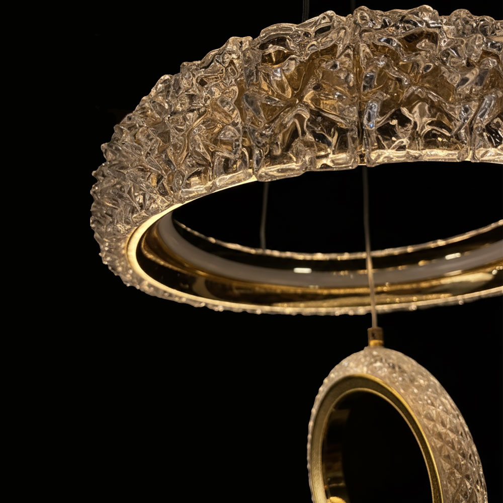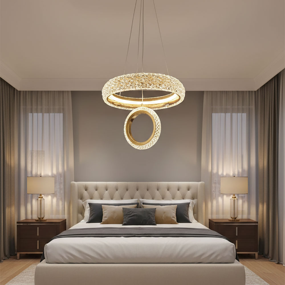 Le lustre Alliance Lumineuse est une suspension moderne et raffinée conçue pour sublimer vos espaces de vie. Il se compose de deux anneaux lumineux superposés aux lignes épurées, dans une finition dorée élégante, associés à des diffuseurs en plexiglas pour une lumière douce, homogène et sans éblouissement.