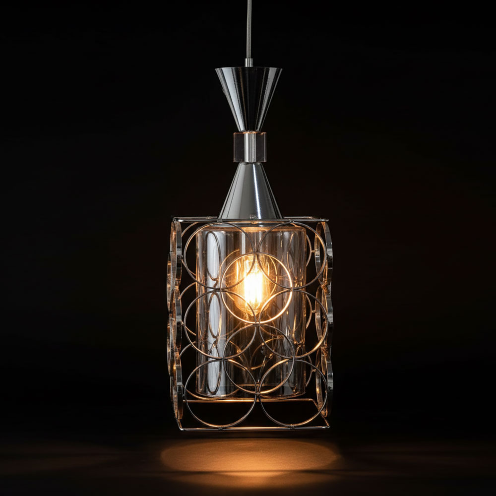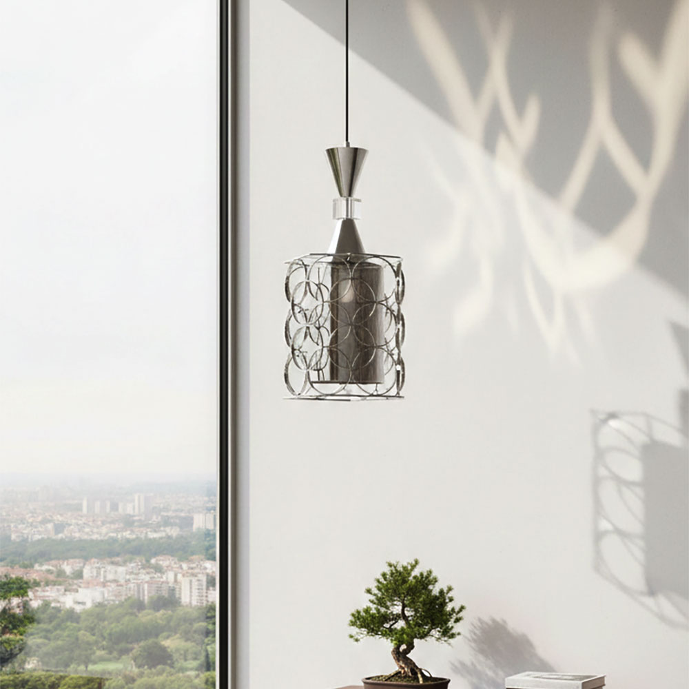 Disponible en tailles 13 cm et 20 cm, cette suspension s’adapte à tous les espaces, qu’il s’agisse d’un coin lumineux, d’une table , tout en apportant un design contemporain et graphique. Sa finition argentée reflète subtilement la lumière, offrant un jeu de reflets élégant et raffiné.